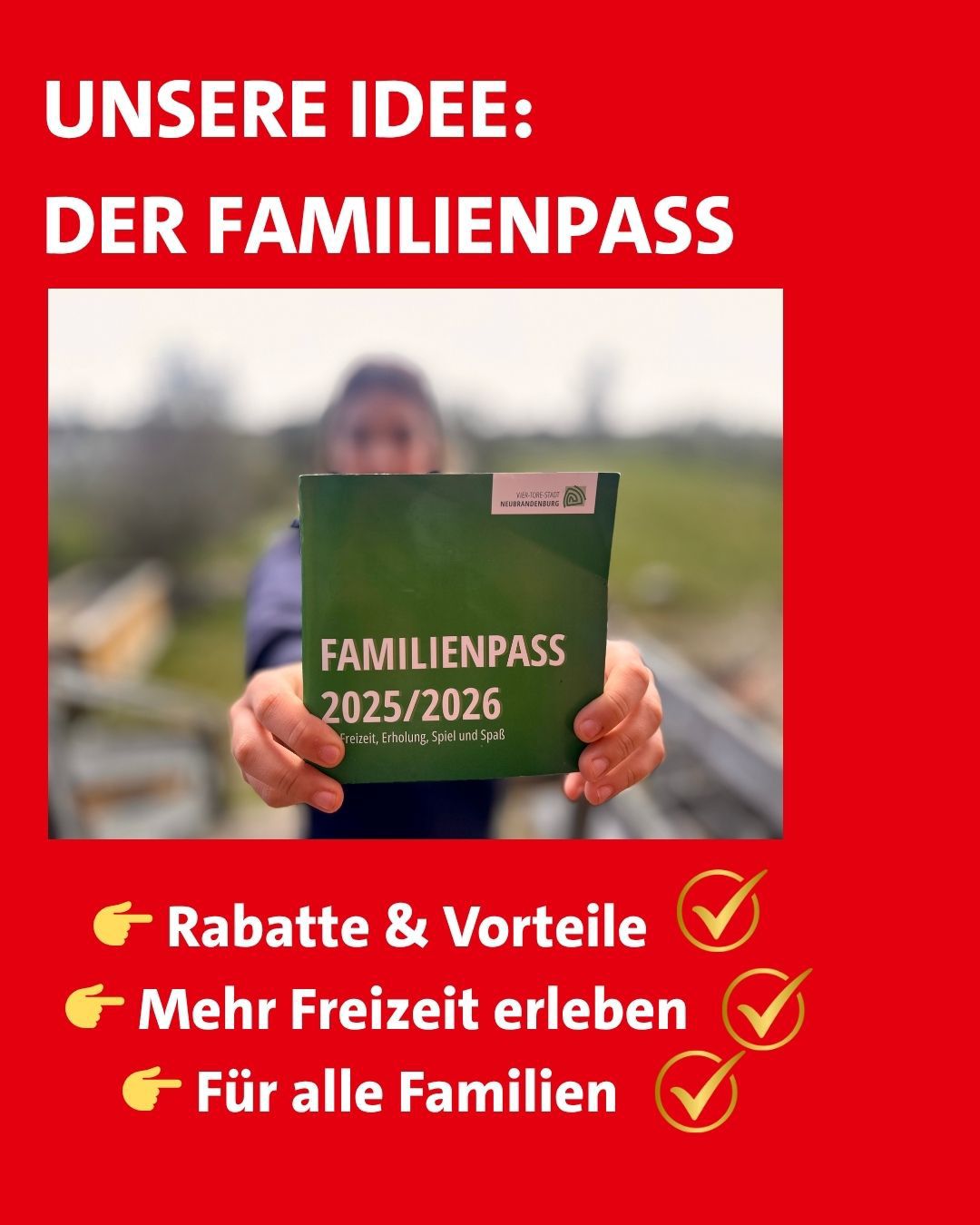 Familien sind ein zentraler Bestandteil des gesellschaftlichen Lebens in Waren. Ein Familienpass unterstützt sie ganz praktisch: Er erleichtert den Zugang zu kulturellen und freizeitbezogenen Angeboten, stärkt gleichzeitig die Sichtbarkeit lokaler Einrichtungen und Vereine und macht Waren als familienfreundlichen Wohnort noch attraktiver.